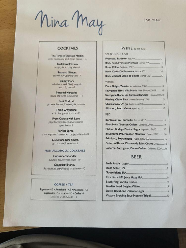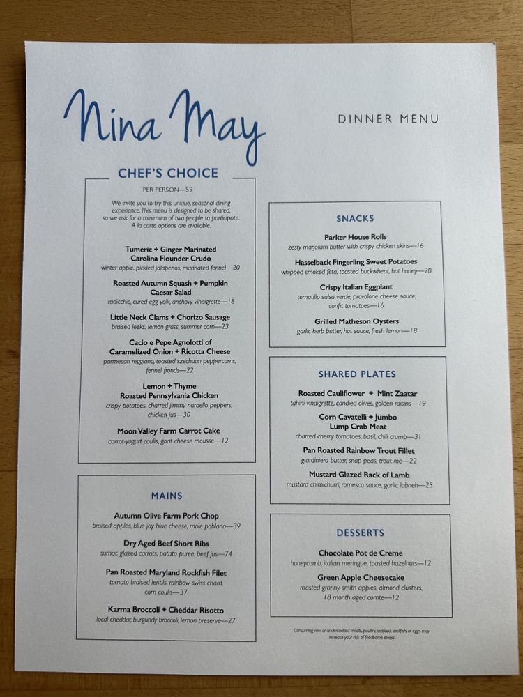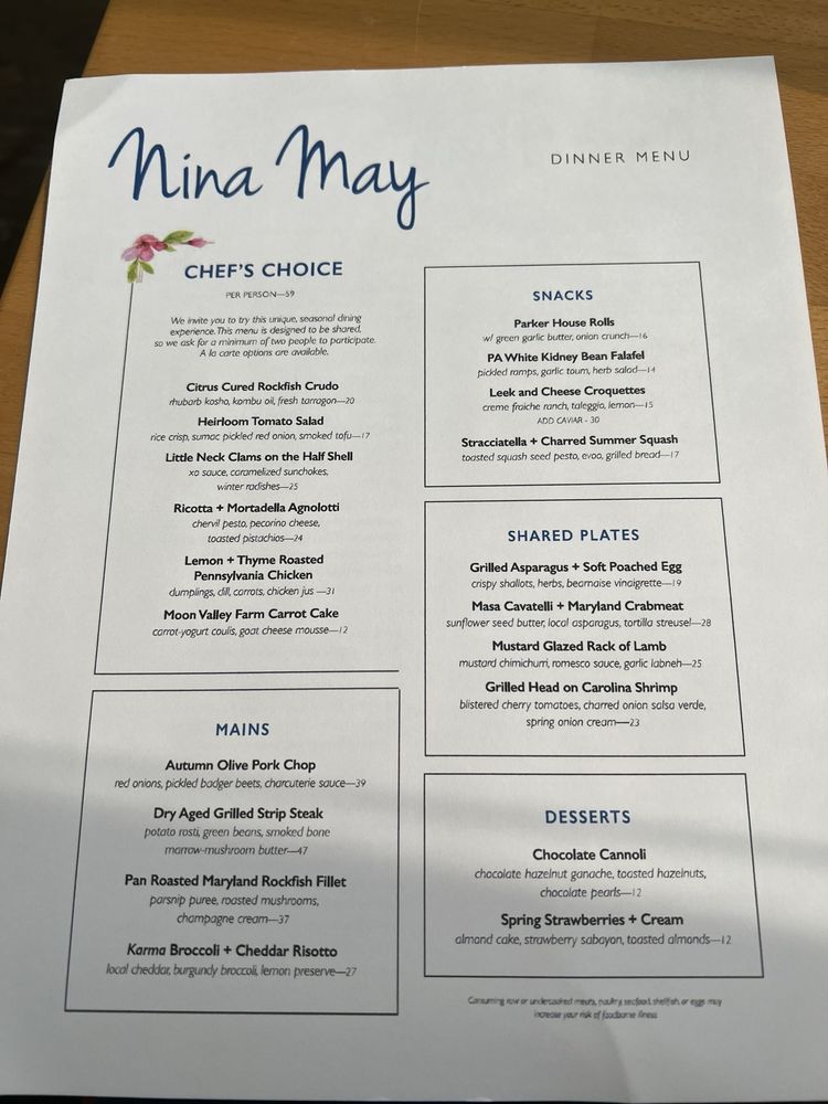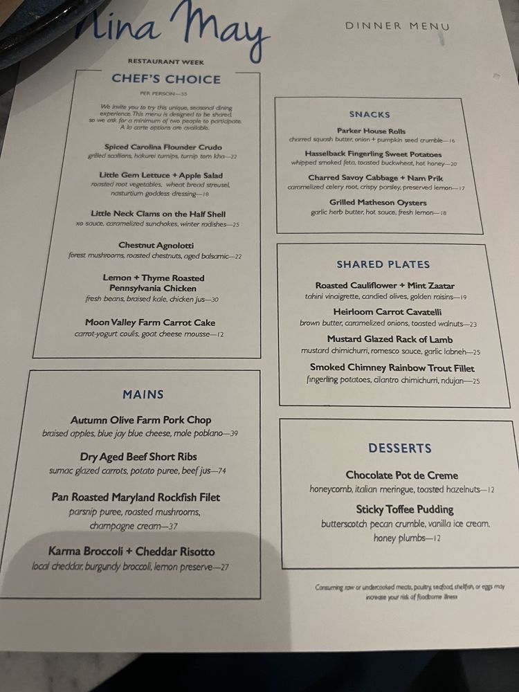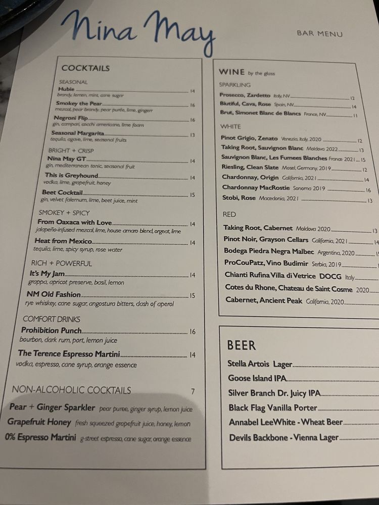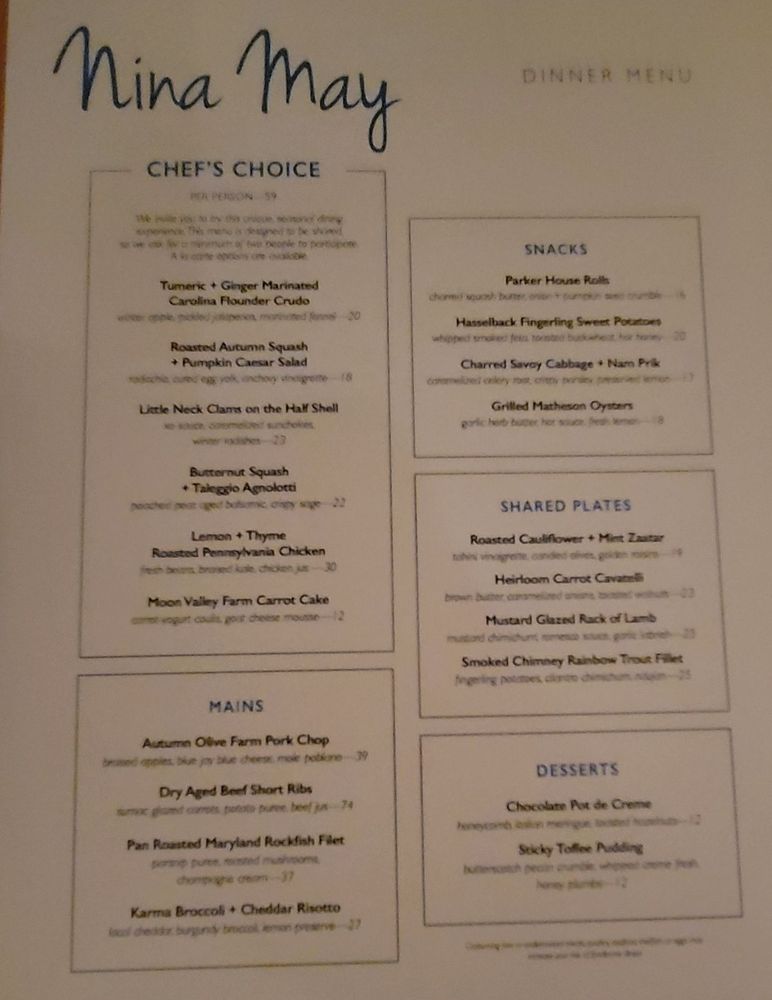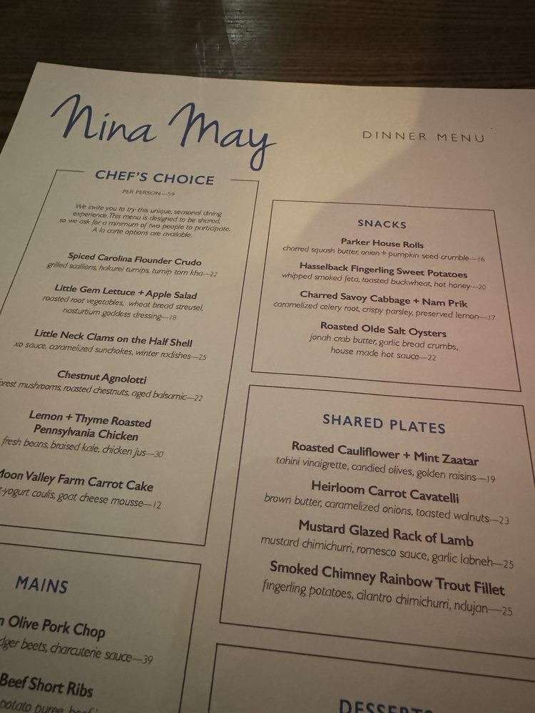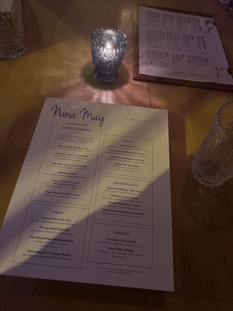 Introducing the menu at Nina May, a cozy and classy restaurant in Washington, DC. With a focus on fresh and flavorful dishes, Nina May offers a variety of options for everyone. From Butternut Squash Agnolotti with Braised Leg of Lamb to Heirloom Carrot and Brown Butter Cavatelli, the menu boasts creative and delicious choices. Vegetarians can enjoy dishes like Winter Kale with Poached Bosc Pears or Shaved Rainbow Carrot and Baby Beets. Seafood lovers will appreciate the Herb Crusted Blue Catfish and Stuffed Rainbow Trout options. The ambiance is intimate and romantic, perfect for a date night or special occasion. With excellent service, a charming decor, and mouthwatering food, Nina May is a must-visit dining destination in the heart of DC.
